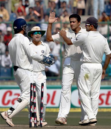 साथी खिलाड़ियों के साथ कप्तान कुंबले ब्रैड हेडिन का विकेट लेने के बाद खुशी मनाते हुए.