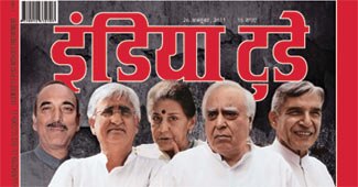 9वें इंडिया टुडे स्टेट ऑफ द स्टेट्स कॉनक्लेव 2011 के दौरान (बाएं से दाएं) इंडिया टुडे के एडीटोरियल डाइरेक्टर एम जे अकबर, असम के मुख्यमंत्री तरुण गोगोई, महाराष्ट्र के मुख्यमंत्री पृथ्वीराज चव्हाण, इंडिया टुडे ग्रुप के चेयरमैन और एडीटर इन चीफ अरुण पुरी और केंद्रीय भूतल परिवहन मंत्री सीपी जोशी.