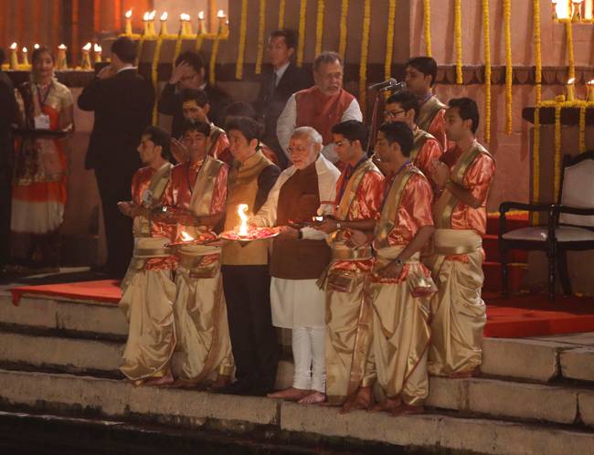 पीएम नरेंद्र मोदी जापान के प्रधानमंत्री शिंजो आबे के साथ शनिवार शाम को अपने संसदीय क्षेत्र वाराणसी पहुंचे और दोनों ने यहां के मशहूर दशाश्वमेध घाट पर गंगा आरती में शिरकत की. आगे देखिए दोनों देशों के प्रधानमंत्रियों की और शानदार तस्वीरें...
