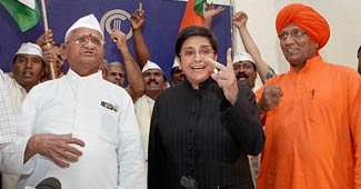 पूर्व आईपीएस अधिकारी किरण बेदी, आरटीआई मुहिम के प्रणेता अरविंद केजरीवाल और स्वामी अग्निवेश के साथ अन्ना हजारे.