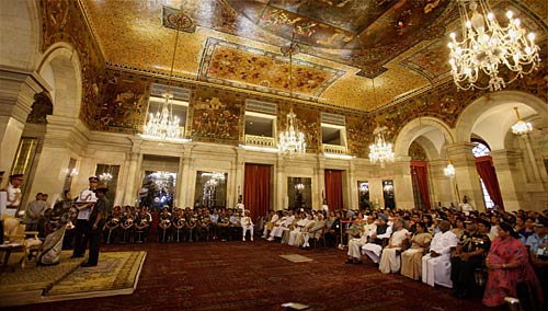 राष्ट्रपति भवन के अशोक हाल में आयोजित रक्षा अलंकरण समारोह आयोजित किया गया. इस मौके पर प्रधानमंत्री मनमोहन सिंह, उनकी पत्नी गुरशरण कौर, विपक्ष की नेता सुषमा स्वराज, सेना प्रमुख वी के सिंह भी मौजूद रहें.