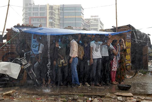 अपने आप को बारिश से बचाने का प्रयास करते लोग.