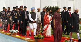 संसद भवन पहुचने पर लोगों का अभिवादन करती ममता बनर्जी.