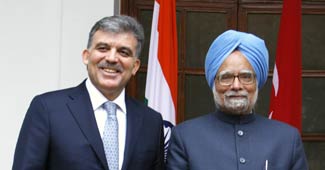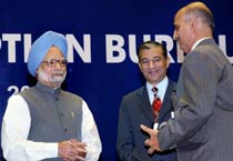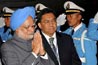 हैदराबाद हाउस से ब्रिटेन के प्रधानमंत्री डेविड कैमरून के साथ बाहर आते प्रधानमंत्री डॉक्‍टर मनमोहन सिंह.
