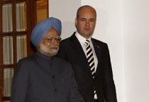 हैदराबाद हाउस में ब्रिटेन के प्रधानमंत्री डेविड कैमरून से मिलते प्रधानमंत्री मनमोहन सिंह.