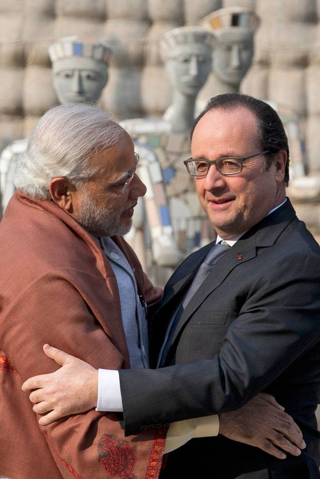 रविवार 24 जनवरी 2016 को तीन दिन के भारत दौरे पर पहुंचे फ्रांस के राष्ट्रपति फ्रांस्वा ओलांद का प्रधानमंत्री नरेंद्र मोदी ने जोरदार स्वागत किया. मोदी ने चंडीगढ़ के रॉक गार्डन में ओलांद को गले लगाया.
