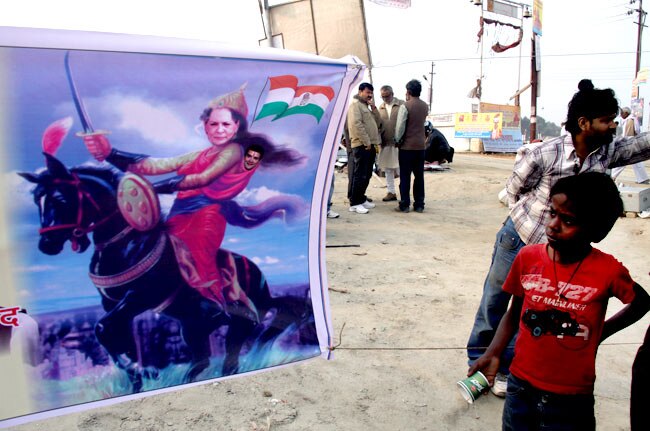 कांग्रेसी कार्यकर्ताओं ने एक और छोटा होर्डिग मेला क्षेत्र में लगाया है. इसमें सोनिया को झांसी की रानी के रूप में दिखाया गया है. उनके पीछे एक बच्चा बंधा हुआ है. इसमें राहुल की तस्वीर लगाई गई है.