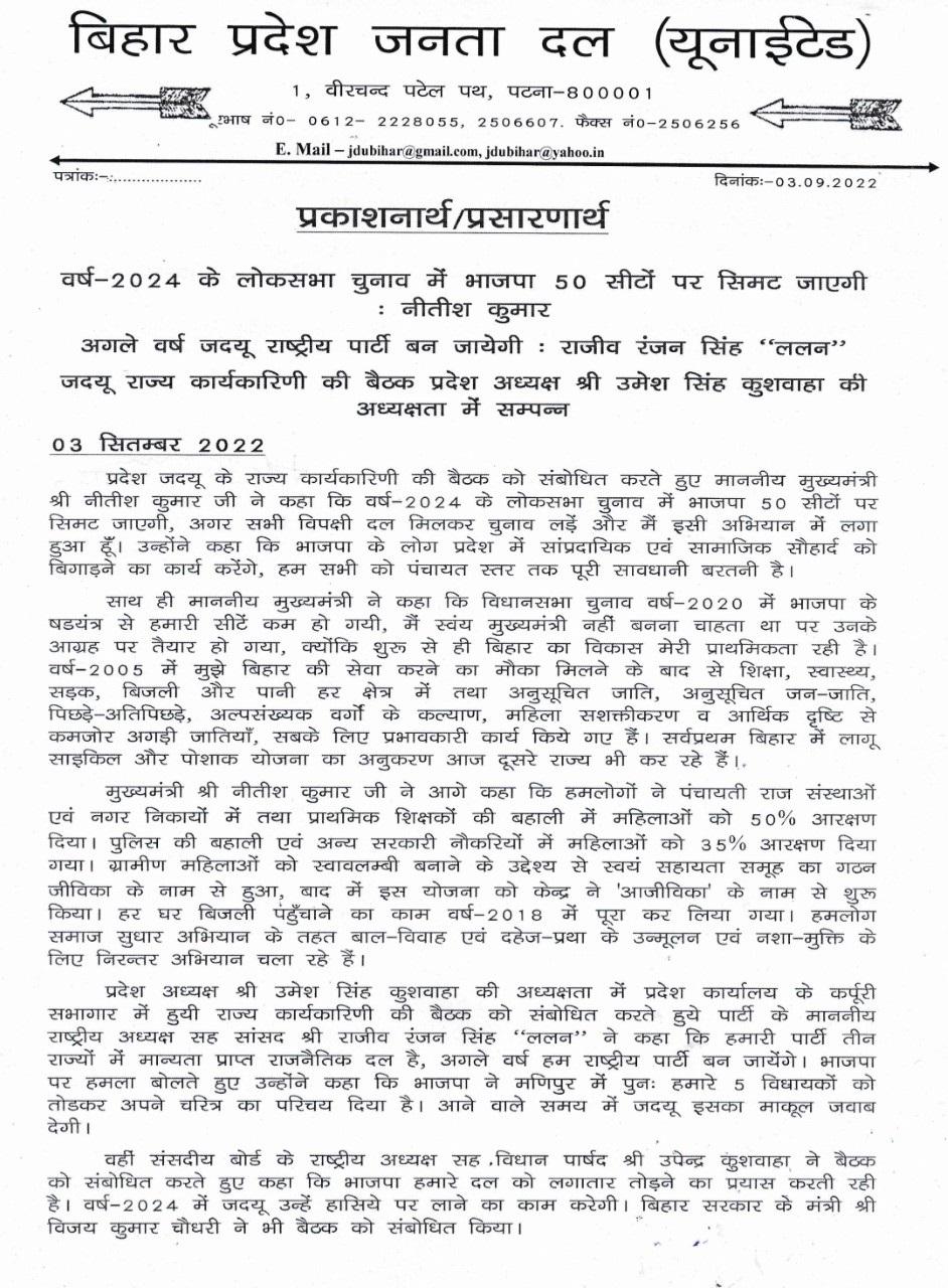 JDU ने जारी की थी प्रेस विज्ञप्ति