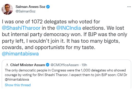 सलमान अनीस सोज़ ने कहा कि मैं 1072 डेलीगेट्स में शामिल था. जिन्होंने कांग्रेस के अध्यक्ष पद के लिए हुए चुनावों में शशि थरूर को वोट दिया था. उन्होंने कहा कि हम हार गए, लेकिन पार्टी के आंतरिक लोकतंत्र की जीत हुई है. अगर बीजेपी ही एकमात्र पार्टी बची होती, तो भी मैं इसमें शामिल नहीं होता. सोज ने कहा कि इसमें बहुत सारे कट्टर, कायर और अवसरवादी हैं.