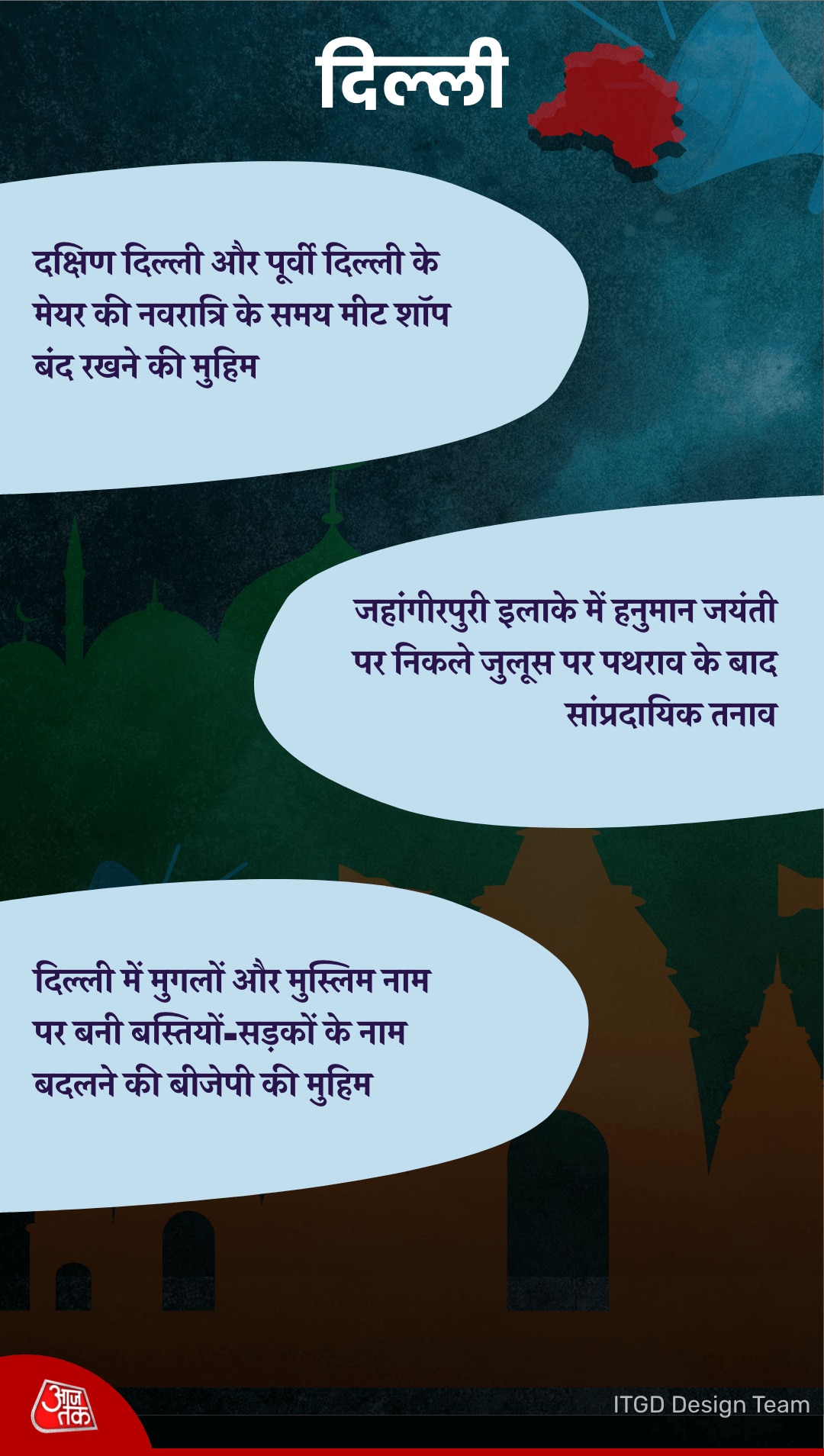 दिल्ली के जहांगीरपुरी इलाके में हनुमान जयंती पर निकले जुलूस पर पथराव से सांप्रदायिक तनाव बन गया था और दोनों ही समुदाय आमने-सामने आ गए थे. जहांगीरपुरी इलाके में माहौल बिगाड़ने के लिए दोनों ही समुदाय के लोगों को गिरफ्तार भी किया गया. बीजेपी ने नवरात्रि के दौरान मांस की दुकाने बंद कराने का अभियान चलाया. दक्षिण दिल्ली और पूर्वी दिल्ली के मेयर ने नवरात्रि के समय मीट शॉप बंद रखने को कहा है. दक्षिण दिल्ली नगर निगम के मेयर मुकेश सूर्यन ने कमिश्नर ज्ञानेश भारती को एक पत्र लिखकर कहा कि नवरात्रि के समय मीट की दुकानें खोलने की जरूरत नहीं है. उन्होंने कहा कि 11 अप्रैल तक मीट शॉप को बंद रखने की अपील की.