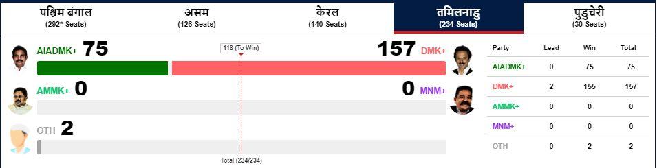 दक्षिण के दुर्ग में सबसे कांटे की लड़ाई तमिलनाडु में देखने को मिली. यहां पर सत्ताधारी AIADMK के चुनाव हार गई है, जबकि DMK की अगुवाई वाला गठबंधन जीत गया है. पहली बार राज्य में जयललिता, करुणानिधि की गैर मौजूदगी में चुनाव हुआ. और एमके स्टालिन ने बाजी मार ली. हालांकि, चुनाव से पहले जिस तरह से एक तरफा मुकाबले के कयास लगाए जा रहे थे उससे इतर AIADMK ने तगड़ी फाइट दी है. तमिलनाडु में इस बार भी बीजेपी का कोई खास जादू नहीं चला, जबकि दूसरी ओर कमल हासन खुद चुनाव हार गए. तमिलनाडु के नतीजे इस प्रकार हैं...