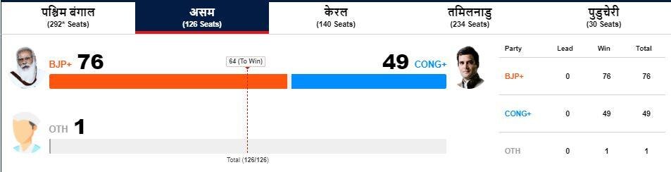 पूर्वोत्तर में भारतीय जनता पार्टी लंबे वक्त से खुद को मजबूत करने में जुटी थी, अब असम के चुनावों ने उसकी मेहनत पर मुहर लगा दी है. बीजेपी लगातार दूसरी बार सत्ता में आई है और उसने कांग्रेस के हर प्लान को फेल कर दिया. कांग्रेस की प्रियंका गांधी वाड्रा, भूपेश बघेल ने लंबे वक्त तक असम में पांव जमाए और कांग्रेस की नैया पार लगाने की कोशिश की. लेकिन हेमंता बिस्वा शर्मा के जादू के आगे उनकी एक ना चल सकी. असम में CAA-NRC का मुद्दा जोरों पर था, लेकिन बीजेपी को यहां सफलता मिली. अब देखना होगा कि हेमंता को मुख्यमंत्री पद मिलेगा या फिर सर्वानंद सोनोवाल ही कमान संभालेंगे. असम के नतीजे इस प्रकार हैं...