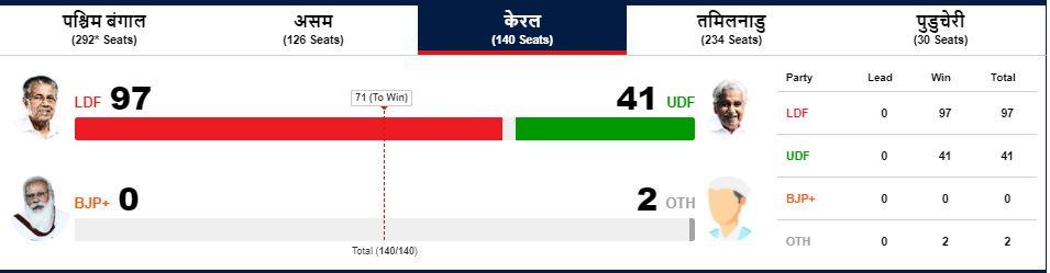 देश में इस वक्त केरल ही ऐसा राज्य है, जहां पर लेफ्ट की सरकार है. एक बार फिर यहां पर पिनराई विजयन की अगुवाई में लेफ्ट का जादू चला और केरल में लगातार दूसरी बार उनकी सरकार बन गई. कांग्रेस के राहुल गांधी यहां से सांसद हैं, ऐसे में उम्मीद थी कि कांग्रेस की अगुवाई वाले गठबंधन को कुछ लाभ मिलेगा, लेकिन ऐसा हो नहीं सका और पिनराई विजयन के आगे हर कोई फेल दिखा. केरल के नतीजे इस प्रकार हैं...