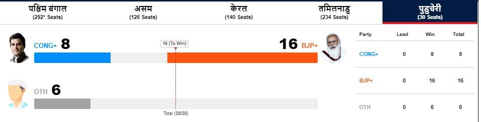 विधानसभा चुनाव से पहले किसी ने नहीं सोचा था कि केंद्रशासित प्रदेश पुडुचेरी का चुनाव भी इतना दिलचस्प होगा. चुनाव से पहले यहां कांग्रेस की सरकार गिर गई, राष्ट्रपति शासन लगा, बाद में कांग्रेस ने अपने मुख्यमंत्री को टिकट नहीं मिला. अब चुनाव के नतीजों के बाद राज्य में एनडीए की सरकार बनती दिख रही है. बीजेपी+ को राज्य में 16 सीटें मिल गई हैं, ऐसे में सत्ता में भाजपा का आना तय है. पुडुचेरी के नतीजे इस प्रकार हैं...