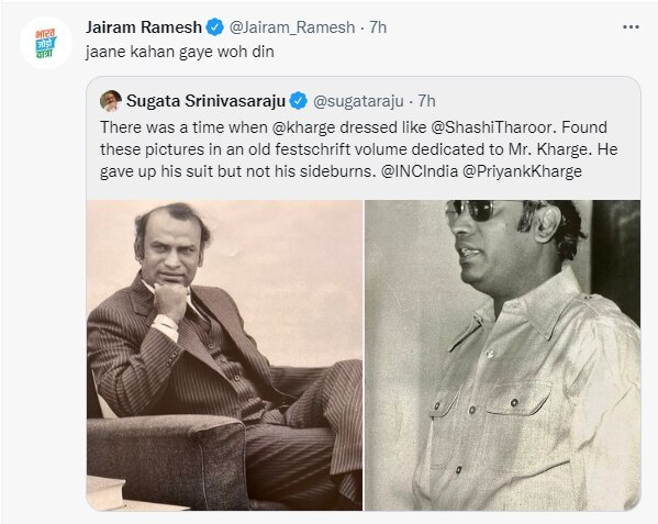 तस्वीरों के साथ में उन्होंने लिखा, "एक समय था जब मल्लिकार्जुन खड़गे शशि थरूर जैसे कपड़े पहना करते थे. ये पुरानी तस्वीरें मिस्टर खड़गे को समर्पित."