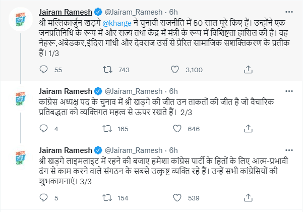जयराम रमेश ने ट्वीट किया, "कांग्रेस अध्यक्ष पद के चुनाव में खड़गे की जीत उन ताकतों की जीत है जो वैचारिक प्रतिबद्धता को व्यक्तिगत महत्व से ऊपर रखते हैं. खड़गे लाइमलाइट में रहने की बजाए हमेशा कांग्रेस पार्टी के हितों के लिए आत्म-प्रभावी ढंग से काम करने वाले संगठन के सबसे उत्कृष्ट व्यक्ति रहे हैं. उन्हें सभी कांग्रेसियों की शुभकामनाएं."