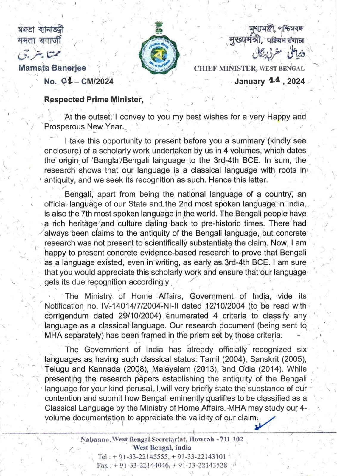 दरअसल, मुख्यमंत्री ममता बनर्जी ने सोशल मीडिया पर बंगाली को शास्त्रीय भाषा का दर्जा दिए जाने के लिए प्रधानमंत्री मोदी को 11 जनवरी को लिखे पत्र की कॉपी शेयर की है. उन्होंने कहा कि बंगाली को मान्यता काफी अभावों के बाद मिली है. ममता बनर्जी ने सोशल मीडिया पर लिखा, "यहां भारत के माननीय प्रधानमंत्री को लिखे गए मेरे पत्र (दिनांक 11 जनवरी 2024) की एक प्रति दी गई है, जिसमें मैंने केंद्र सरकार से बंगाली को शास्त्रीय भाषा के रूप में मान्यता देने की हमारी मांग को स्पष्ट किया था. हमारे तथ्य-आधारित तर्कों को अंततः भारत सरकार ने स्वीकार कर लिया है. पत्र को सार्वजनिक जानकारी के लिए नीचे रखा गया है: मान्यता बहुत वंचना/इनकार के बाद मिली है."
