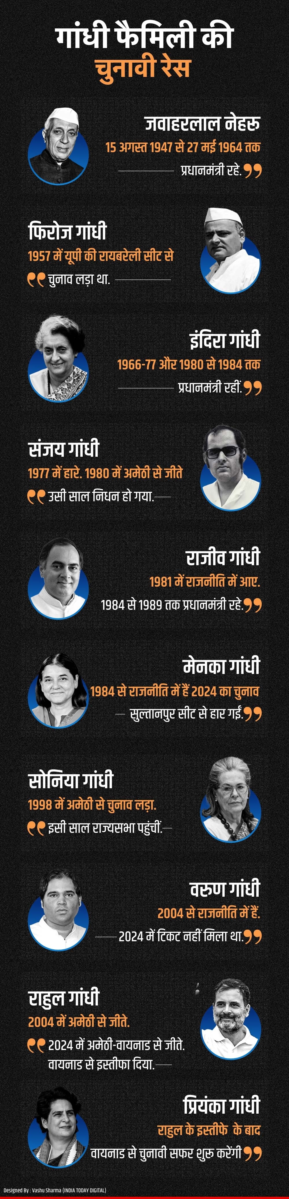 परिवार की महिला सदस्यों की बात करें तो चुनावी राजनीति में उतरने वाली प्रियंका गांधी अपनी दादी इंदिरा गांधी, मां सोनिया गांधी और मेनका गांधी के बाद परिवार की चौथी महिला सदस्य हैं. प्रियंका गांधी से पहले नेहरू-गांधी परिवार के नौ सदस्य चुनावी राजनीति में रह चुके हैं. प्रथम प्रधानमंत्री पंडित जवाहर लाल नेहरू से शुरू हुई इस परिवार और सियासत की जुगलबंदी को अब तक इंदिरा गांधी से लेकर संजय गांधी और फिरोज गांधी से लेकर वरुण गांधी और राहुल गांधी तक ने जारी रखा. अब इस कड़ी में प्रियंका गांधी का नाम भी जुड़ गया है. आइए नजर डालते हैं नेहरू-गांधी परिवार के उन सदस्यों पर जो चुनावी राजनीति में रहे हैं.