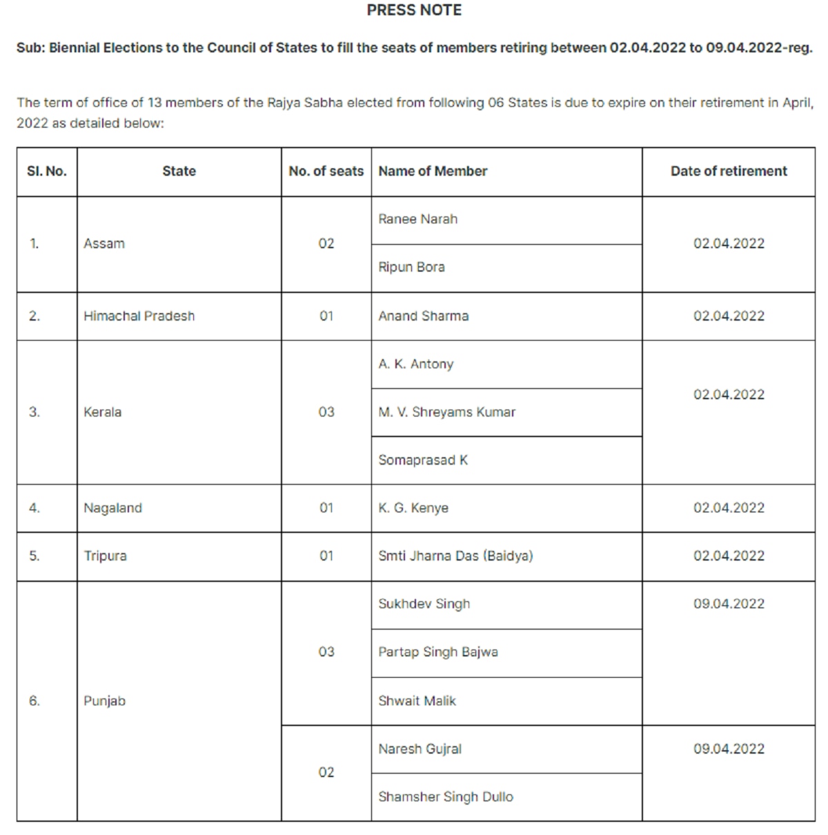 राज्यसभा के जिन सदस्यों का कार्यकाल खत्म हो रहा है उसमें रिपुन बोरा, आनंद शर्मा, सुखदेव सिंह, प्रताप सिंह बाजवा, नरेश गुजराल, शमशेर सिंह, एके एंटनी आदि शामिल हैं.