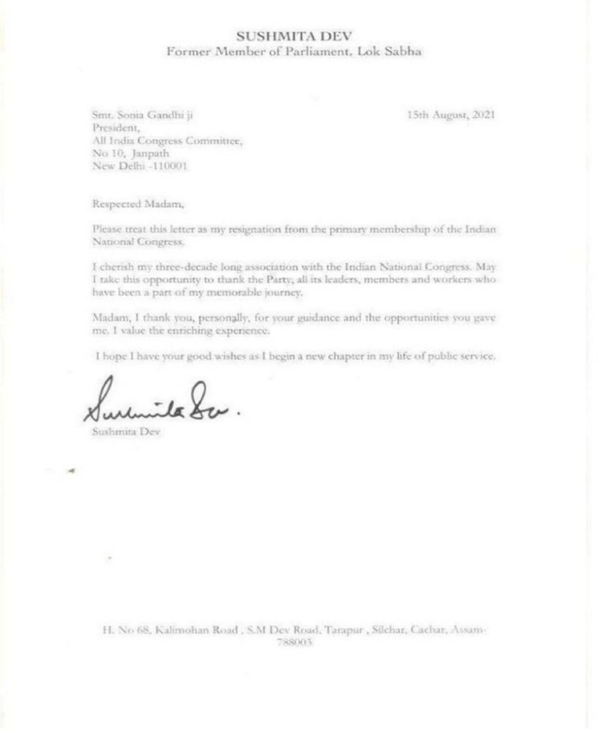 सुष्मिता देव ने अपने इस्तीफे में लिखा है कि वह कांग्रेस की सदस्यता छोड़ रही हैं. आगे लिखा है कि करीब तीस साल कांग्रेस पार्टी के साथ काम करना उनके लिए यादगार रहा. उन्होंने आगे लिखा है कि वह जनकल्याण में आगे का अपना वक्त लगाना चाहती हैं.