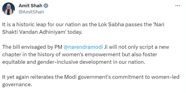 गृह मंत्री अमित शाह ने लिखा, "यह हमारे देश के लिए एक ऐतिहासिक छलांग है क्योंकि लोकसभा ने आज 'नारी शक्ति वंदन अधिनियम' पारित कर दिया है. पीएम मोदी द्वारा परिकल्पित विधेयक न केवल महिला सशक्तिकरण के इतिहास में एक नया अध्याय लिखेगा बल्कि न्यायसंगत और लिंग-समावेशी को भी बढ़ावा देगा. हमारे देश में विकास. यह एक बार फिर महिलाओं के नेतृत्व वाले शासन के लिए मोदी सरकार की प्रतिबद्धता को दोहराता है."