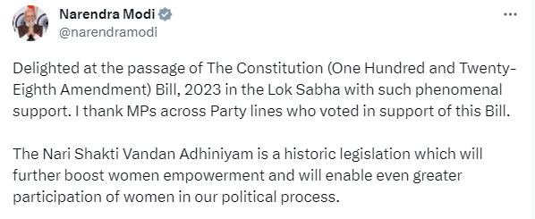 पीएम नरेंद्र मोदी ने बिल का समर्थन करने के लिए सभी पार्टियों के सांसदों को धन्यवाद किया. उन्होंने सोशल मीडिया प्लेटफॉर्म 'एक्स' पर लिखा, "इस अभूतपूर्व समर्थन के साथ लोकसभा में संविधान (128वां संशोधन) विधेयक, 2023 पारित होने पर खुशी हुई. मैं सभी पार्टियों के सांसदों को धन्यवाद देता हूं जिन्होंने इस विधेयक के समर्थन में मतदान किया. नारी शक्ति वंदन अधिनियम एक ऐतिहासिक कानून है जो महिला सशक्तिकरण को और बढ़ावा देगा और हमारी राजनीतिक प्रक्रिया में महिलाओं की और भी अधिक भागीदारी को सक्षम करेगा."