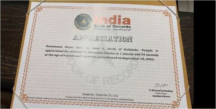 लेकिन गीतांश ने युवराज का रिकॉर्ड तोड़ते हुए 1 मिनट 54 सेकंड में हनुमान चालीसा का पाठ कर दिखाया. जिसके बाद सितंबर 2022 में उसका नाम इंडिया बुक ऑफ रिकॉर्ड में दर्ज किया गया.