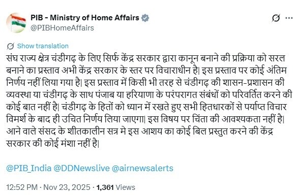 गृह मंत्रालय ने यह भी साफ किया कि इस प्रस्ताव से चंडीगढ़ की मौजूदा प्रशासनिक व्यवस्था में कोई बदलाव नहीं होगा और न ही पंजाब या हरियाणा के पारंपरिक संबंधों पर कोई असर पड़ेगा. मंत्रालय ने कहा कि चंडीगढ़ के हितों को ध्यान में रखते हुए सभी हितधारकों के साथ चर्चा के बाद ही आगे का फैसला लिया जाएगा. साथ ही, यह भी बताया कि आने वाले शीतकालीन सत्र में इस विषय पर कोई बिल लाने की सरकार की मंशा नहीं है.