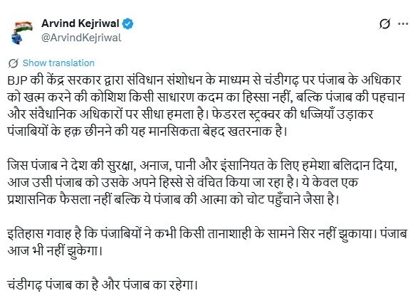अरविंद केजरीवाल ने कहा "BJP की केंद्र सरकार द्वारा संविधान संशोधन के माध्यम से चंडीगढ़ पर पंजाब के अधिकार को खत्म करने की कोशिश किसी साधारण कदम का हिस्सा नहीं, बल्कि पंजाब की पहचान और संवैधानिक अधिकारों पर सीधा हमला है. फेडरल स्ट्रक्चर की धज्जियां उड़ाकर पंजाबियों के हक़ छीनने की यह मानसिकता बेहद खतरनाक है."