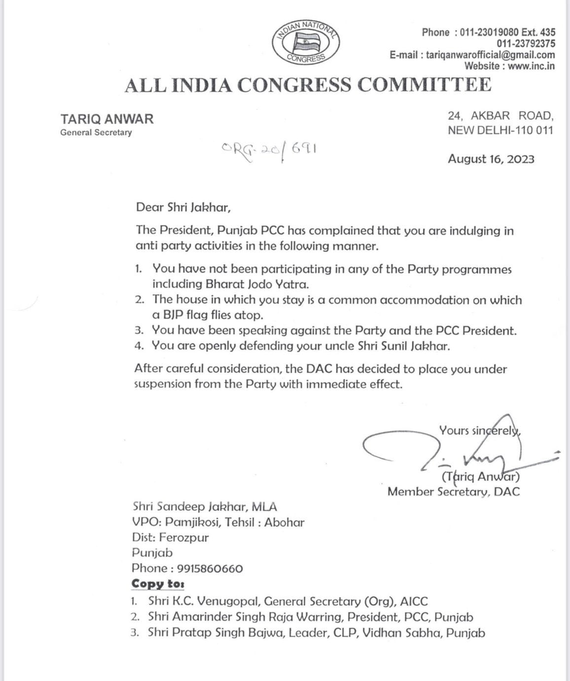 कांग्रेस के महासचिव तारीक अनवर की तरफ से जारी पत्र में कहा गया है कि पंजाब कांग्रेस के अध्यक्ष की तरफ से बताया गया है कि आप पार्टी विरोधी गतिविधियों में शामिल हैं. इनमें-
