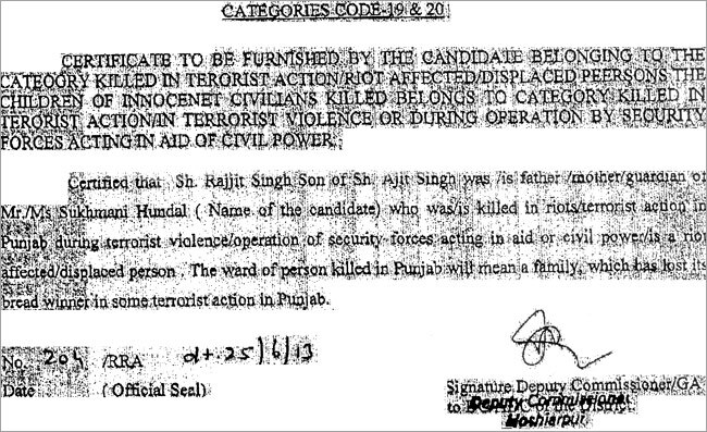 सुखमणि ने यूनिवर्सिटी में होशियारपुर के उपायुक्त वरुण रूजाम की ओर से जारी एक प्रमाण-पत्र प्रस्तुत किया, जिसमें लिखा गया था कि राजजीत सिंह हुंडल पंजाब में हुई एक आतंकवादी वारदात के दौरान मारे गए थे. यह सर्टीफिकेट जून में जारी किया गया था.