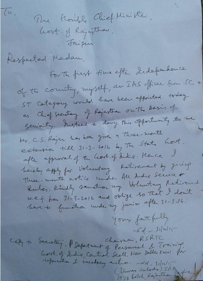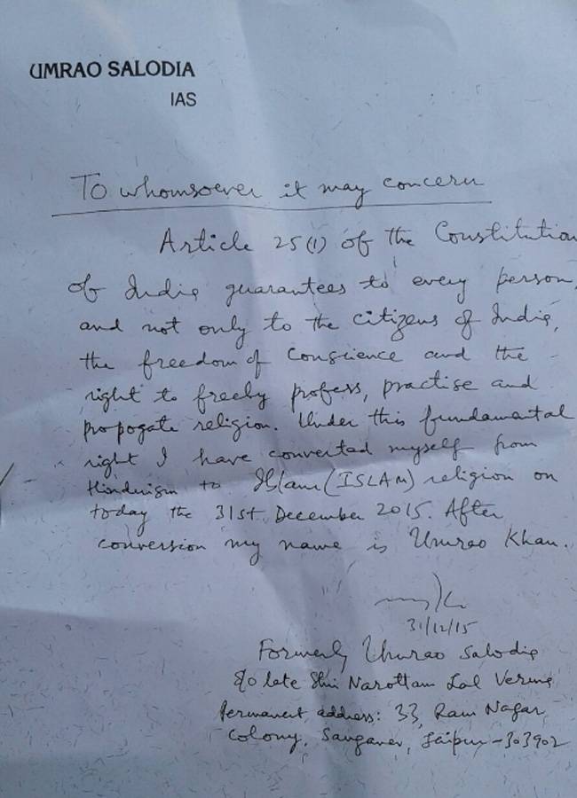 वरिष्ठ आईएएस अधिकारी एसीएस उमराव सलोदिया ने धर्म परिवर्तन के साथ ही अब अपना नाम उमराव खान रख लिया है. उनका कहना है कि मौजूदा मुख्यसचिव सीएस राजन को तीन महीने का एक्सटेंशन दिया गया, जबकि एक दलित को मुख्य सचिव बनने से वंचित रखा गया है. इसके अलावा उमराव सलोदिया ने एच्छिक सेवानिवृति यानी वीआरएस के लिए भी आवेदन कर दिया है.
