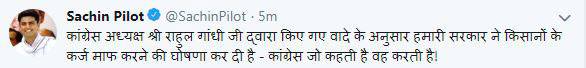 ऋण माफी के बाद राजस्थान के उप मुख्यमंत्री सचिन पायलट ने ट्वीट में लिखा, 'कांग्रेस अध्यक्ष श्री राहुल गांधी जी द्वारा किए गए वादे के अनुसार हमारी सरकार ने किसानों के कर्ज माफ करने की घोषणा कर दी है - कांग्रेस जो कहती है वह करती है!'