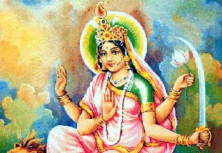चतुर्थ कुष्मांडा- चौथे स्वरूप में देवी कुष्मांडा भक्तों को रोग, शोक और विनाश से मुक्त करके आयु, यश, बल और बुद्धि प्रदान करती हैं. यह बाघ की सवारी करती हुईं अष्टभुजाधारी, मस्तक पर रत्नजडित स्वर्ण मुकुट पहने उज्जवल स्वरूप वाली दुर्गा हैं. अपनी मंद मुस्कान से ब्रह्मांड को उत्पन्न करने के कारण इनका नाम कुष्मांडा पड़ा. कहा जाता है कि जब दुनिया नहीं थी, तो चारों तरफ सिर्फ अंधकार था. ऐसे में देवी ने अपनी हल्की-सी हंसी से ब्रह्मांड की उत्पत्ति की. चतुर्थी के दिन अगर किसी व्यक्ति को अपना शनि शान्ति कराना हो तो यह दिन उनके लिए अच्छा है और ऐसा करके वे लोग शनि के अशुभ प्रभाव से बच सकते हैं. माता कुष्माण्डा की पूजा करने के बाद माता को इस दिन मालपुओं का भोग लगाया जाता है.