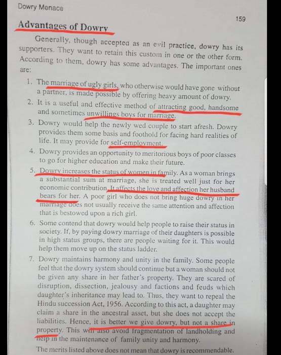 दहेज प्रथा समाज के लिए अभिशाप है और भारतीय कानून के हिसाब से दहेज लेना और देना कानूनन अपराध है. ये बातें सभी जानते हैं, लेकिन क्या आपको पता है कि दहेज प्रथा के अपने फायदे हैं. जी हां, बेंगलुरु के एक मशहूर कॉलेज में बीए फाइनल ईयर के स्टूडेंट को दहेज प्रथा के फायदे गिनाने वाले नोट्स बांटे गए हैं. इन नोट्स में बताया गया है कि दहेज बदसूरत लड़कियों के लिए फायदेमंद है क्योंकि भारी दहेज से उनकी शादी मुमकिन हो पाती है.