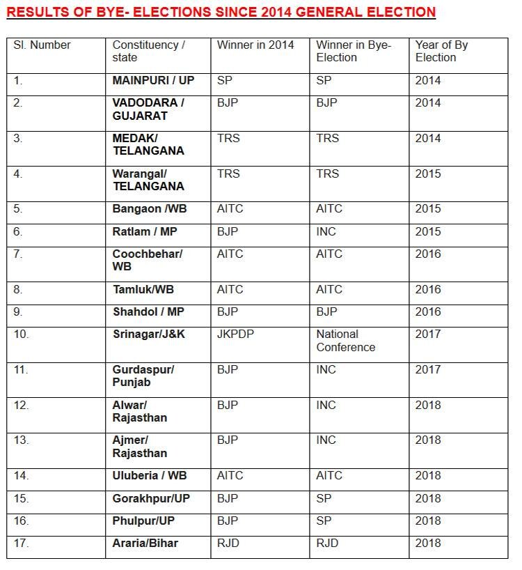मई 2014 लोकसभा चुनाव में 282 सीटें जीतकर आयी बीजेपी तब से हुए उपचुनावों में बेहतर प्रदर्शन करने में नाकाम रही है जिससे वर्तमान में उसकी लोकसभा में सदस्यों की संख्या स्पीकर को छोड़ दें तो यह घटकर 270 हो गयी है जो कि बहुमत के आंकड़े के बराबर है. ऐसा नहीं है कि इससे मोदी सरकार पर किसी तरह का खतरा है क्योंकि एनडीए के दूसरे सहयोगी दल उसके साथ हैं. इन उपचुनावों में बीजेपी की हार की वजह या तो एंटी-इंकम्बेंसी है या फिर विपक्षी दलों का एक जुट होना. आइये जानते हैं पिछले चार वर्षों में समय-समय पर हुए लोकसभा उपचुनावों में कैसे बीजेपी का प्रदर्शन गिरता जा रहा है.