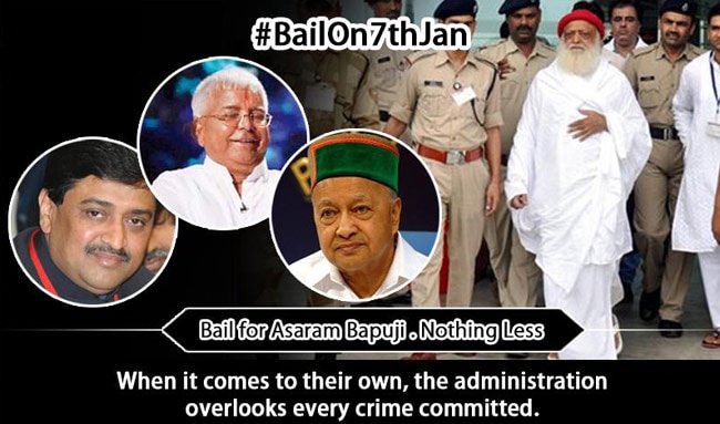गौरतलब है कि जेल में बंद आसाराम के समर्थक उन्हें जमानत दिलाने के लिए सोशल मीडिया में रविवार से काफी सक्रिय हो गए थे. रविवार से ट्विटर पर #BailOn7thJan और #Bapuji हैशटैग टॉप 10 ट्रेंड में बना हुआ है. दरअसल, समर्थकों की मांग है कि आसाराम को न्याय मिले और उन्हें 7 जनवरी को जमानत दी जाए.