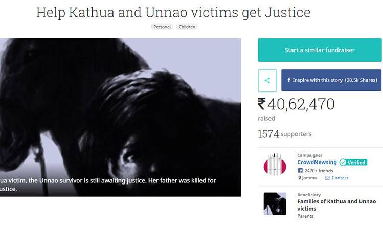 वो आगे बताती हैं, 'कठुआ मामले के पीड़ित परिवार अपना अकाउंट खुलवा रहे हैं ऐसा मुझे तालिब और दीपिका के मार्फत पता चला है और उन्नाव मामले के पीड़ित परिवार ने पैन कार्ड के लिए अप्लाई किया है. हमने किसी के अकाउंट में कोई पैसा नहीं मंगवाया. अभी तक करीब-करीब 45 लाख रुपये इकट्ठा हुए हैं और सारे के सारे पैसे www.crowdnewsing.com और उसको सपोर्ट दे रही www.ketto.org के पास ही हैं. अगर किसी को इस बारे में कोई शक हो तो वो वहां से पूरी जानकारी ले सकते हैं.’