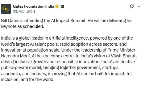 मंगलवार को पहले खबर आई बिल गेट्स भारत में चल रहे AI समिट्स में शामिल नहीं होंगे. लेकिन इसके बाद गेट्स फाउंडेशन ऑफ इंडिया ने कहा कि बिल गेट्स AI समिट में शामिल हो रहे हैं और वह अपना संबोधन भी देंगे. बयान में कहा गया कि भारत 'आर्टिफिशियल इंटेलिजेंस में ग्लोबल लीडर”' है, जो दुनिया के सबसे बड़े AI टैलेंट पूल में से एक है और इसे तेज़ी से क्रॉस-सेक्टर अपनाया जा रहा है.