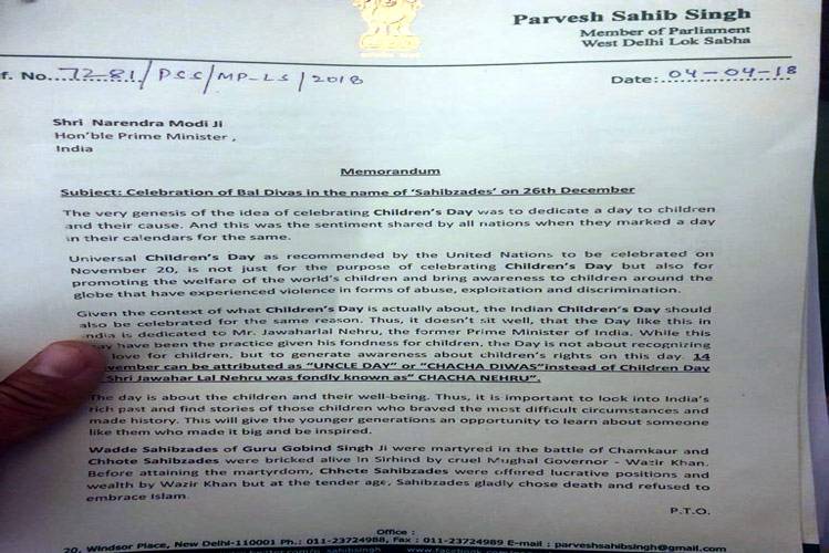बीजेपी सांसद प्रवेश वर्मा ने पीएम को लिखे लेटर में कहा है कि 26 दिसंबर को बाल दिवस मनाया जाना चाहिए.