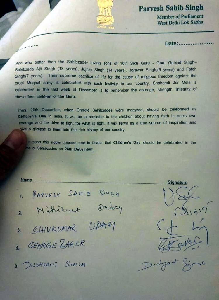 यही वजह है कि प्रवेश वर्मा उनकी शहादत को याद करने के लिए इस दिन को बाल दिवस के रूप में मनाना चाहते हैं. प्रवेश वर्मा द्वारा लिखे इस पत्र को 60 सांसदों ने हस्ताक्षर कर समर्थन दिया है.