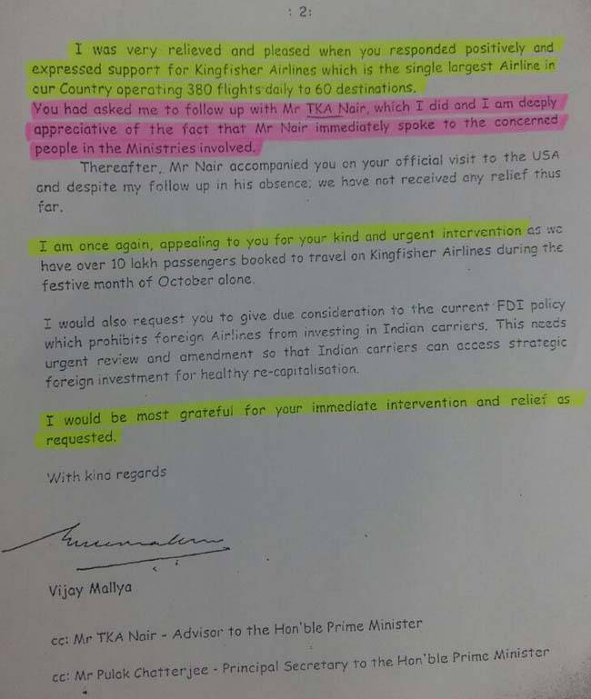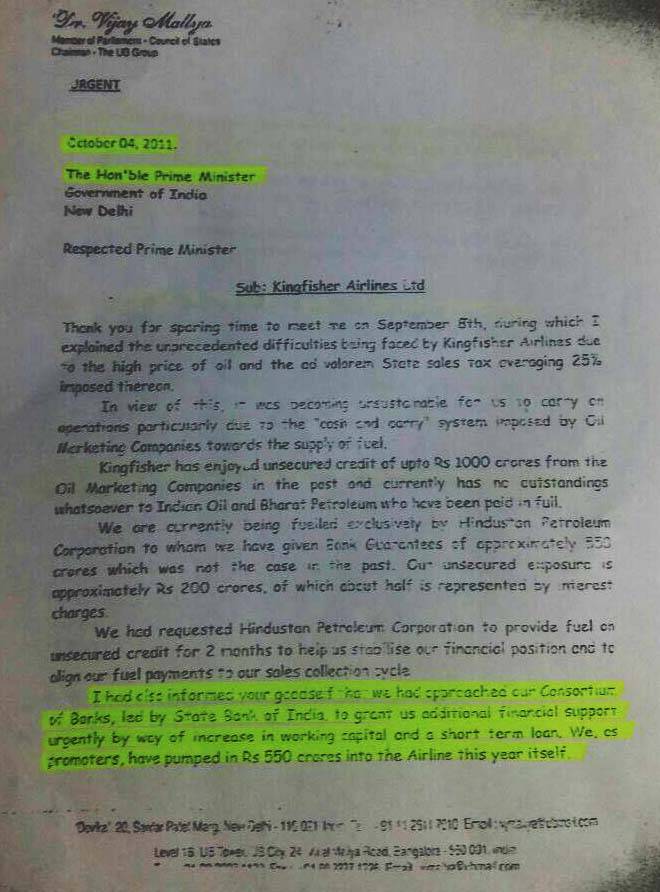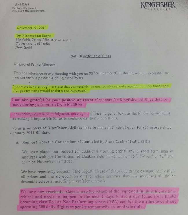 मनमोहन सिंह को लिखी गई पहली चिट्ठी पर 4 अक्टूबर 2011 की तारीख पड़ी हुई है. जिसमें माल्या ने अपनी किंगफिशर एयरलाइन की मदद के लिए एसबीआई से अतिरिक्त आर्थिक मदद की गुहार की थी. दूसरी चिट्ठी पर 22 नवंबर 2011 की तारीख पड़ी हुई है. दूसरी चिठ्ठी में भी माल्या ने डूब रही किंगफिशर को बचाने की अपील की है.