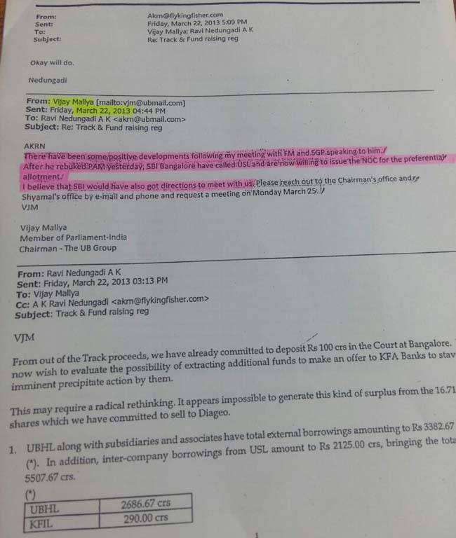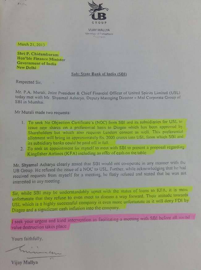 21 मार्च 2013 को तत्कालीन वित्त मंत्री पी. चिदंबरम को लिखी गई चिठ्ठी में माल्या ने वित्तमंत्रालय से अपील की थी कि वे एसबीआई से एनओसी दिलाने की अपील की थी. जिसकी मदद से वे दो हजार करोड़ रुपए इकट्ठा करना चाह रहे थे.