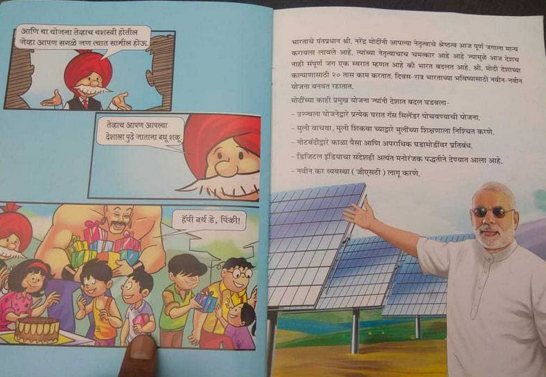 आरटीआई एक्टिविस्ट विहार धुर्वे का कहना है कि किताब के हर पेज पर मोदी की तस्वीर का इस्तेमाल किया गया है, इसके मायने ये है कि बीजेपी मोदी को ज्यादा प्रमोट करने में शामिल हैं. और इसमें बच्चों के लिए पूरक स्तरीय पठन को बहुत कम संदेश है.