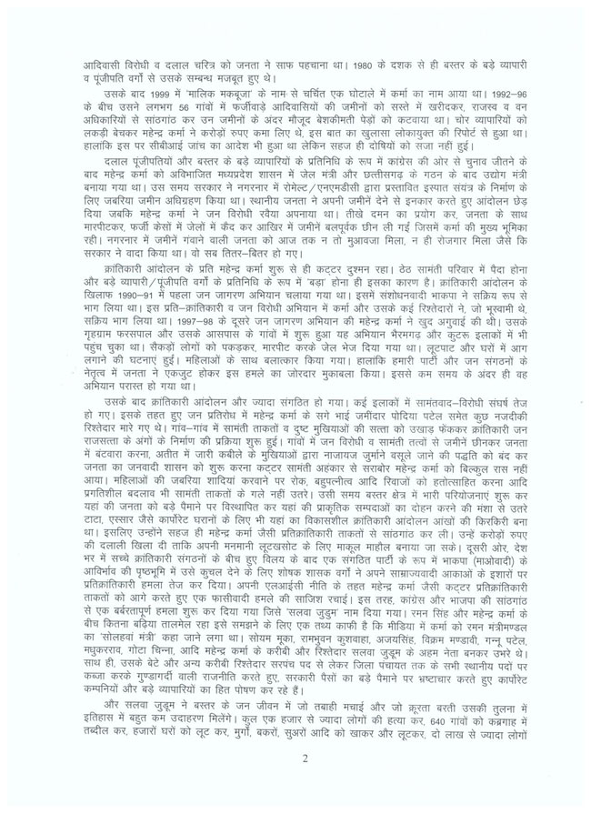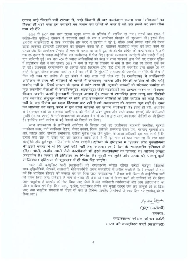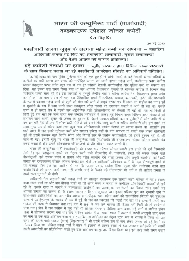 दंडकारण्य SZC ने सुकमा में कांग्रेसी नेताओं पर हमले की जिम्मेदारी ली है. संगठन की ओर से गुडसा उसेंडी ने इस संबंध में एक प्रेस नोट जारी किया गया है. प्रेस नोट में नक्सलियों ने कहा, हमारे निशाने पर बीजेपी और कांग्रेस दोनों ही पार्टियां हैं. छत्तीसगढ़ में हुए नक्सली हमले की जिम्मेदारी लेते हुए दंडकारण्य कमेटी ने मीडिया को चिट्ठी लिखी है. चिट्ठी में साफ कहा गया है कि इस हमले से नक्सलियों ने सलवा जुडूम का बदला लिया है. आप भी पढ़ें क्या लिखा है नक्सलियों ने प्रेस नोट में.