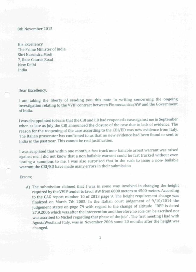 इससे पहले, अगस्टा वेस्टलैंड मामले में एक नया खुलासा हुआ. सौदेबाजी में बिचौलिए की भूमिका निभाने वाले क्रिश्चियन मिशेल ने प्रधानमंत्री नरेंद्र मोदी को एक पत्र लिखा था. यह पत्र नवंबर 2015 में लिखा गया है.