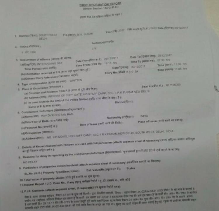 जनरल स्टाफ कैंप से चोरी इस कार की रिपोर्ट दिल्ली के आरके पुरम थाने में 30 दिसंबर को दर्ज कराई गई है. CRPF जवान चेतनराम की तरफ से दी गई लिखित शिकायत में यह कहा गया है कि उसने 29 दिसंबर को ड्यूटी खत्म करके शाम के सवा 7 बजे जम्मू-कश्मीर की रजिस्ट्रेशन प्लेट लगी हुई टाटा सूमो कार JK 02 AW 5441 को CRPF कैंप पर पार्क किया. दूसरे दिन सुबह जब वह सफाई के लिए पहुंचा तो गाड़ी वहां से गायब थी, जिसके बाद इसकी सूचना पुलिस को दी गई.