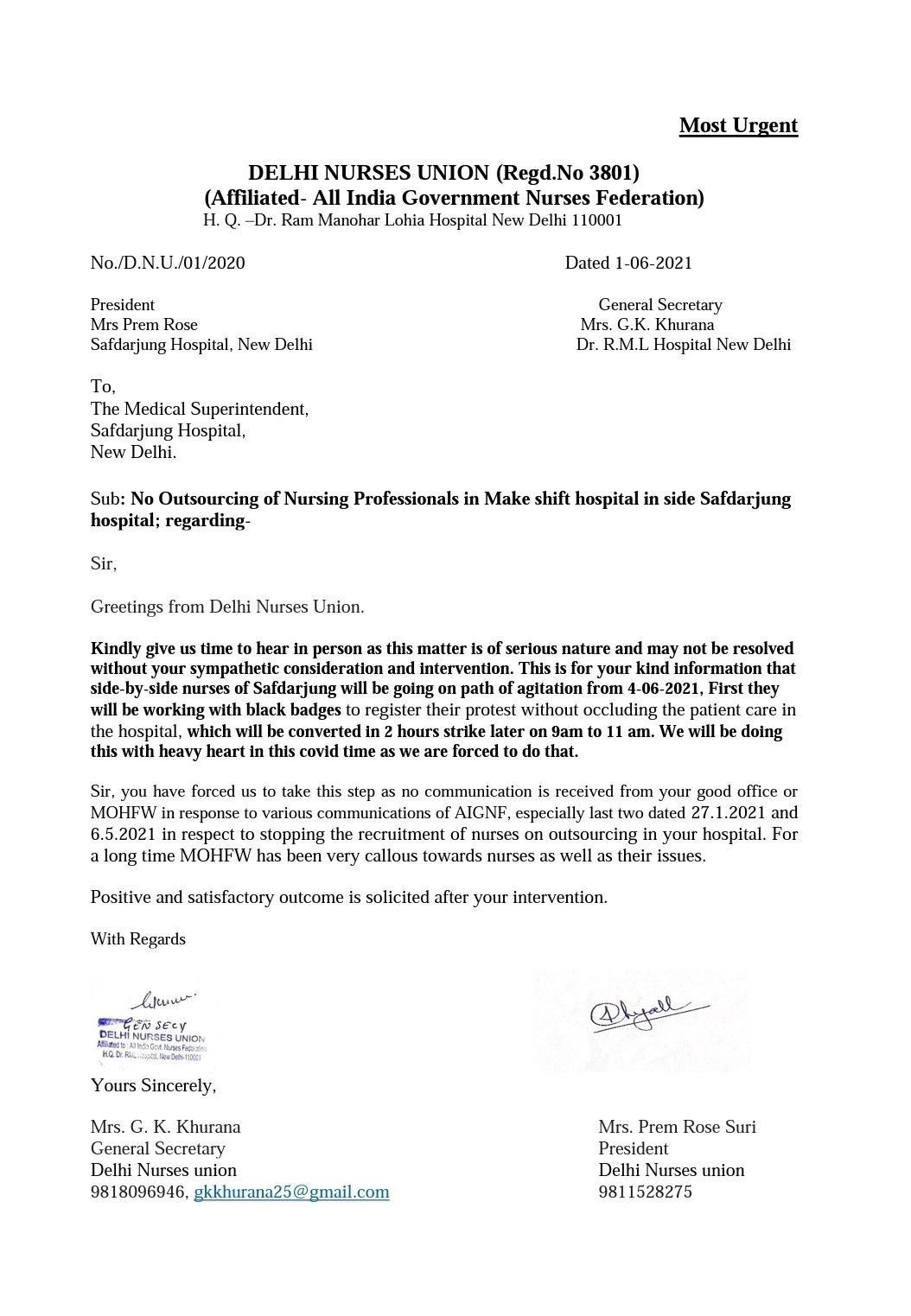 दिल्ली नर्सेज यूनियन की अध्यक्ष प्रेम रोज़ और महासचिव जीके खुराना ने सफदरजंग अस्पताल के चिकित्सा अधीक्षक को वर्तमान में चल रही नर्सों की भर्ती की प्रक्रिया के खिलाफ एक पत्र लिखा. पत्र में यूनियन ने कहा कि अस्पताल प्रशासन हमारी बातों को व्यक्तिगत रूप से सुनने का समय दें क्योंकि यह मामला गंभीर है. आपके सहानुभूतिपूर्ण विचार और हस्तक्षेप के बिना इसे हल नहीं किया जा सकता है.