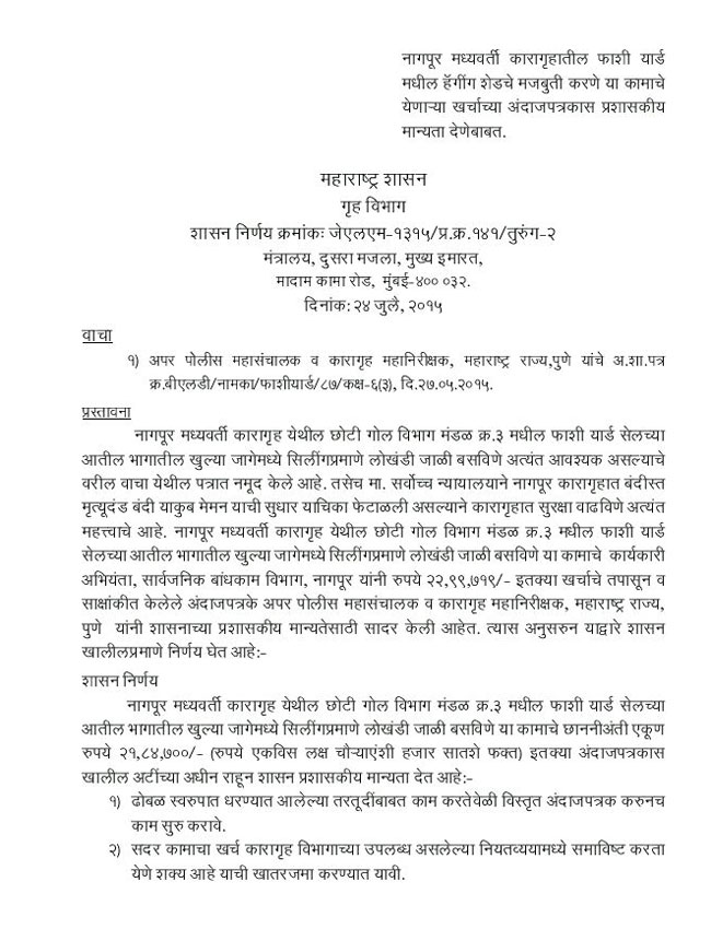 महाराष्ट्र सरकार की ओर से जारी किए गए निर्देशों के मुताबिक, ये फंड याकूब की फांसी के दौरान सुरक्षा व्यवस्था और अन्य दूसरे कामों में खर्च किया जाएगा.