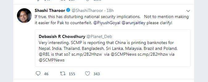 सोमवार को हांगकांग के अखबार में आने के बाद कांग्रेस नेता शशि थरूर ने ट्विटर पर केंद्रीय मंत्री अरुण जेटली और पीयूष गोयल को टैग करते हुए इस पर सफाई मांगी. उन्होंने लिखा है कि अगर यह सच है तो इसका राष्ट्रीय सुरक्षा पर घातक असर हो सकता है. पाकिस्तान के लिए करेंसी का नकल करना और आसान हो जाएगा.